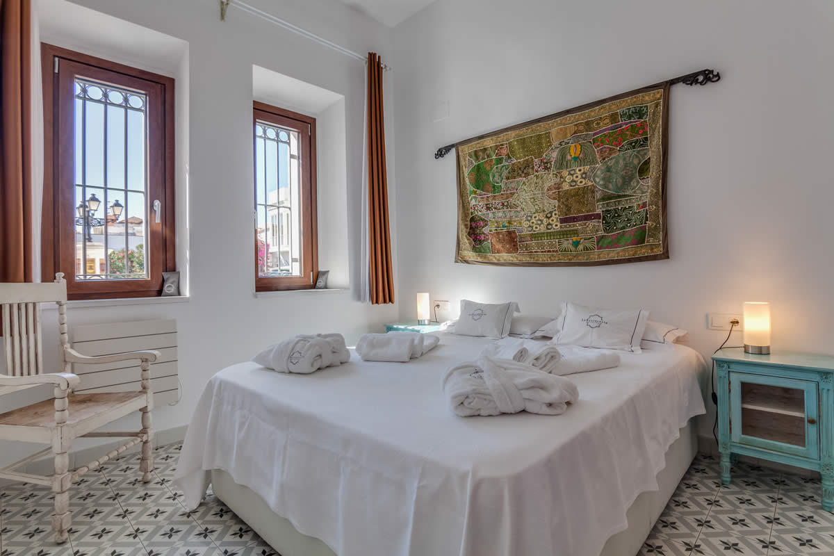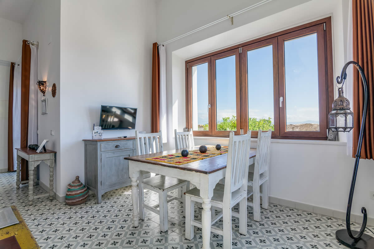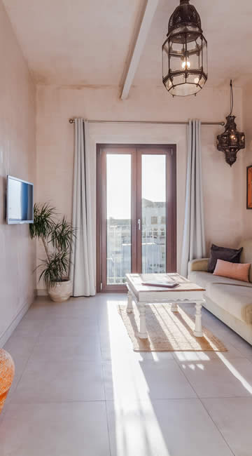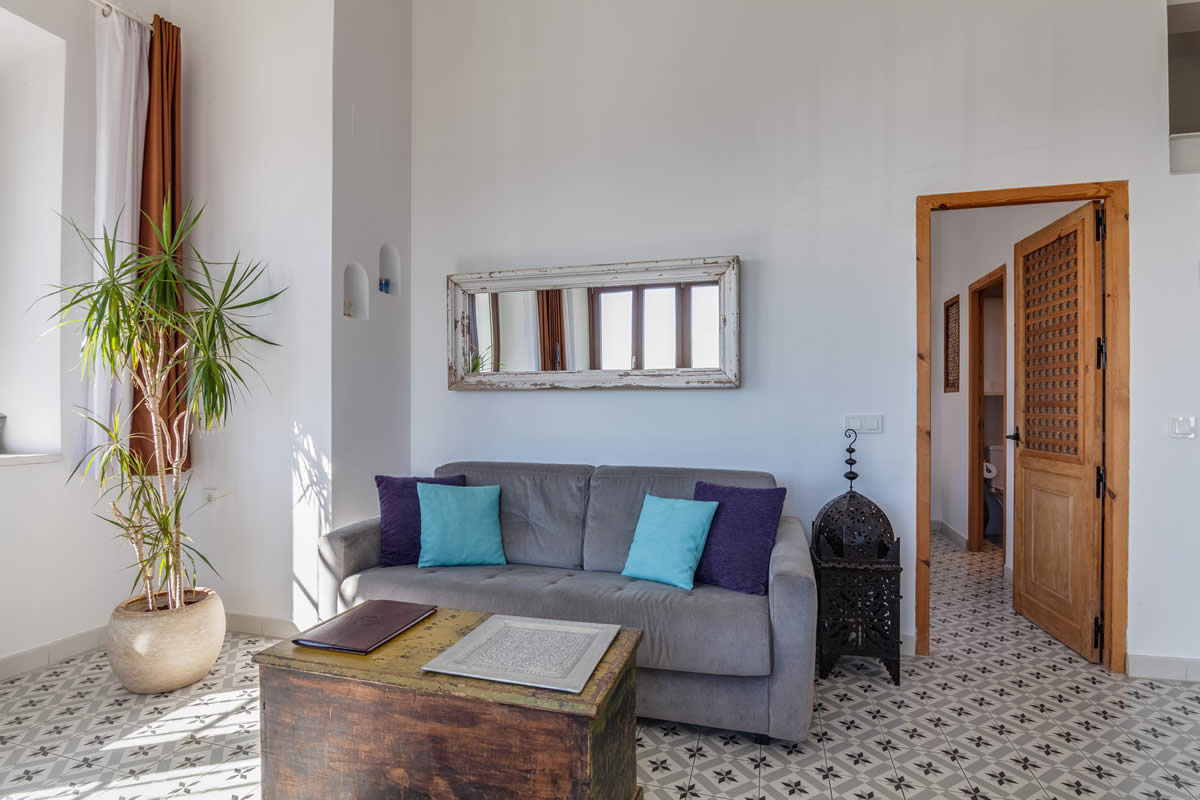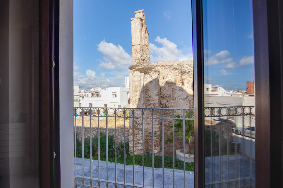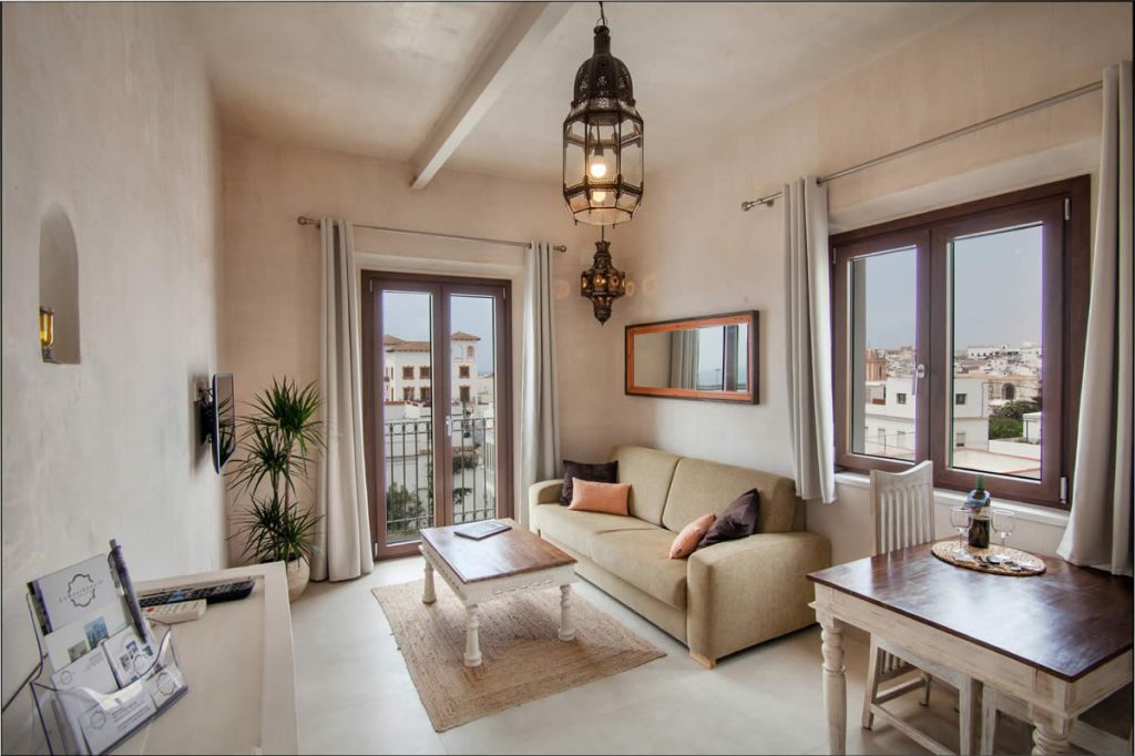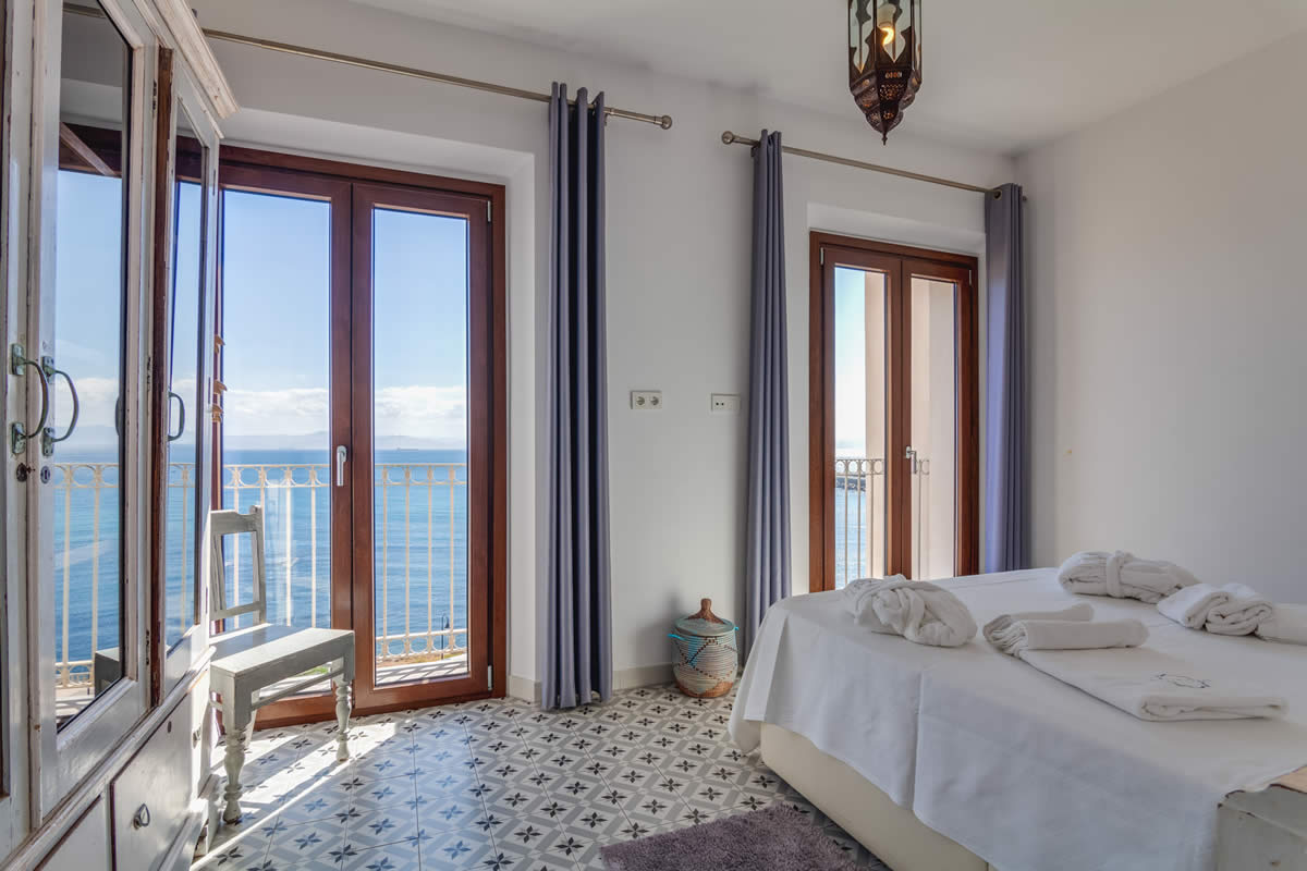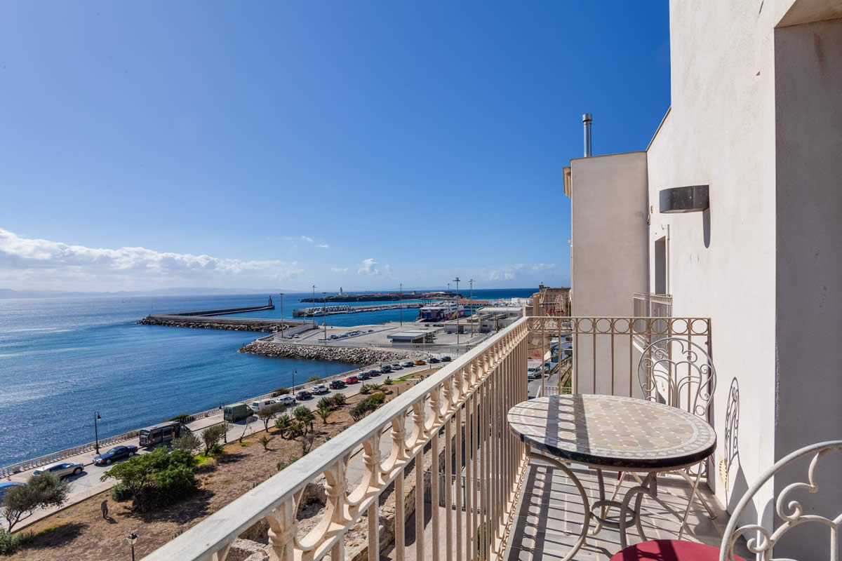 El amplio salón ofrece una vista única de la Plaza «La Mela», el puerto y la costa marroquí. Dando la vuelta al otro lado, disfrutarás de la vista de una iglesia antigua de Tarifa.