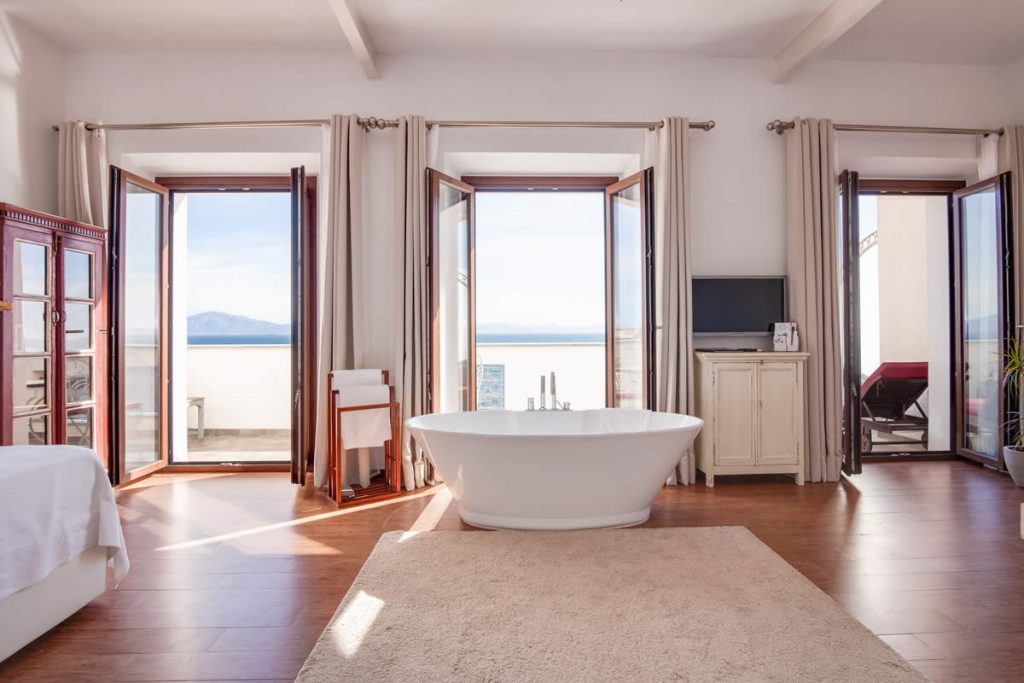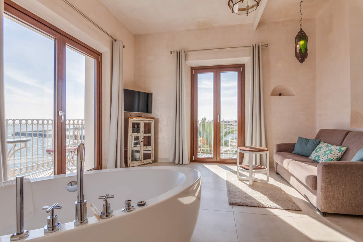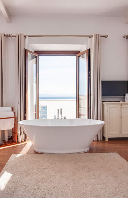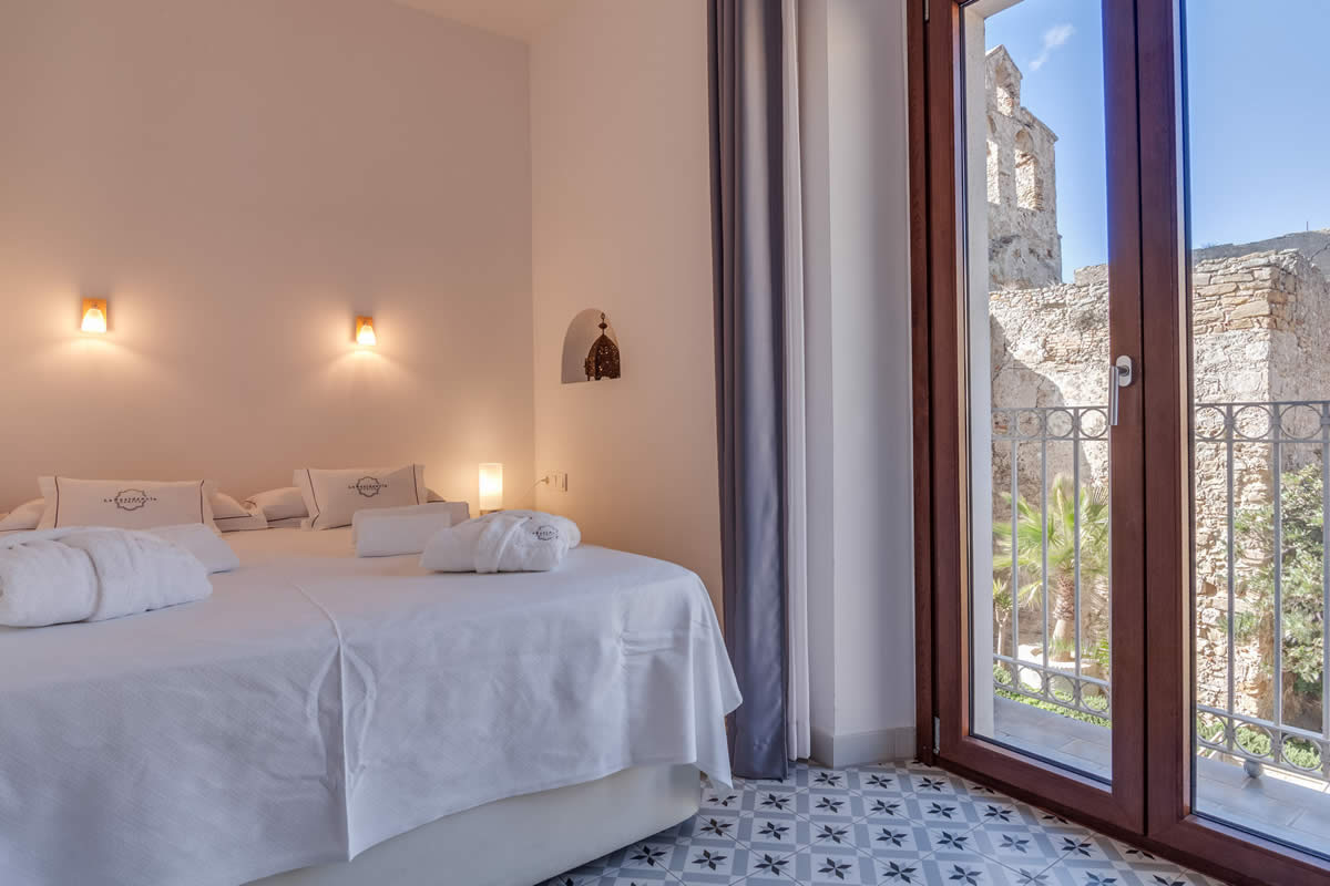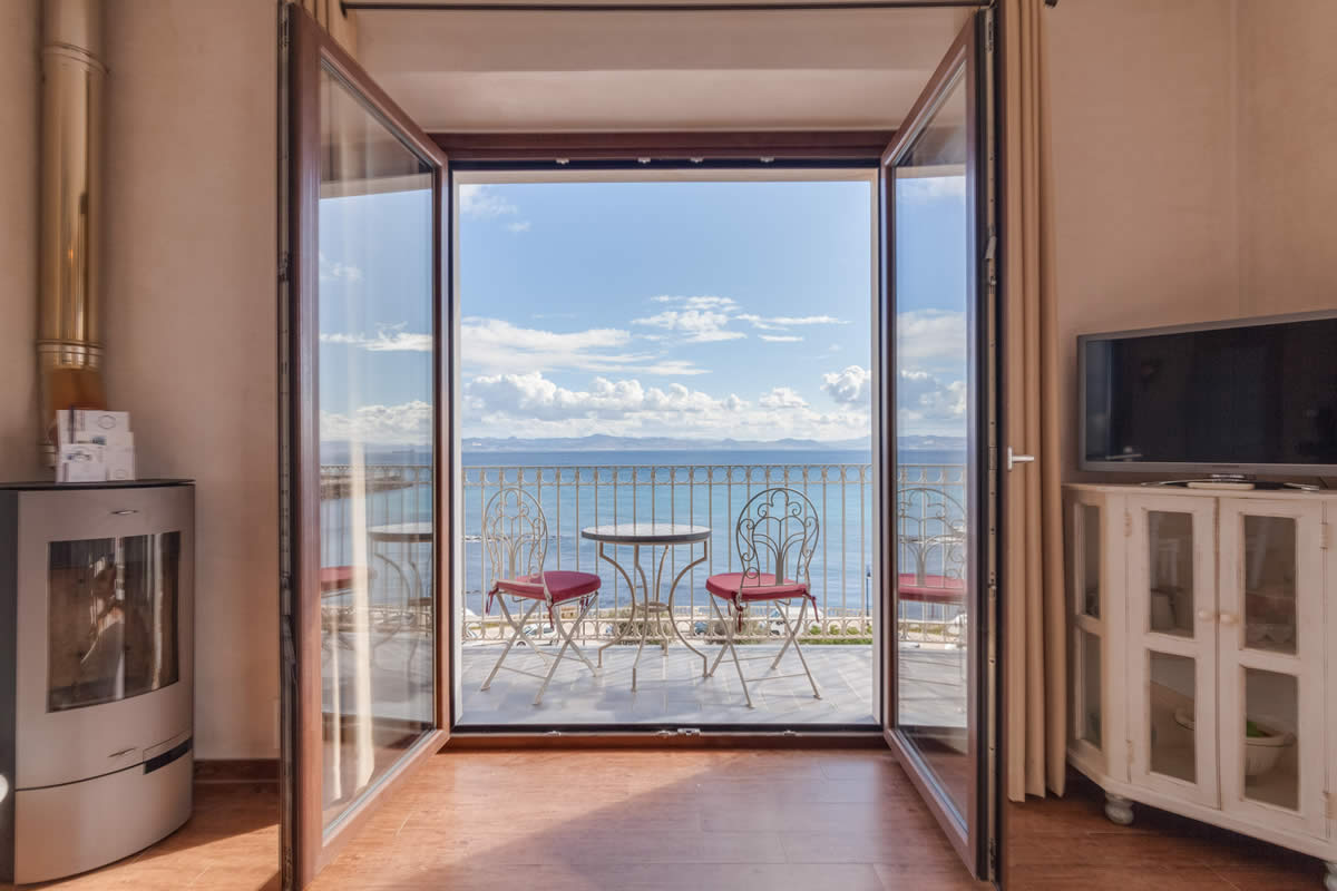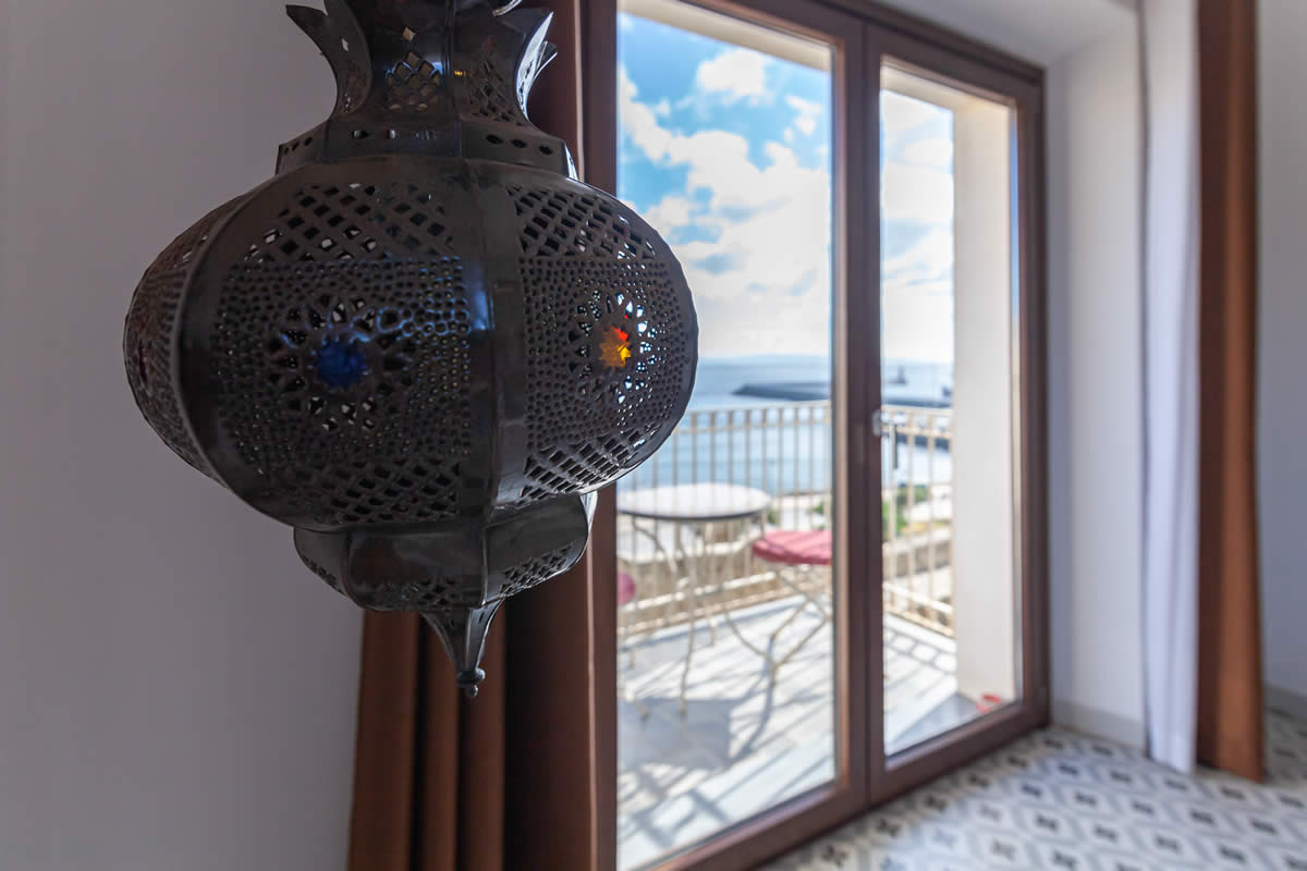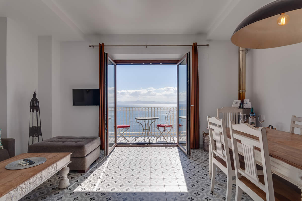 El amplio salón ofrece una vista única de la Plaza «La Mela», el puerto y la costa marroquí. Dando la vuelta al otro lado, disfrutarás de la vista de una iglesia antigua de Tarifa.