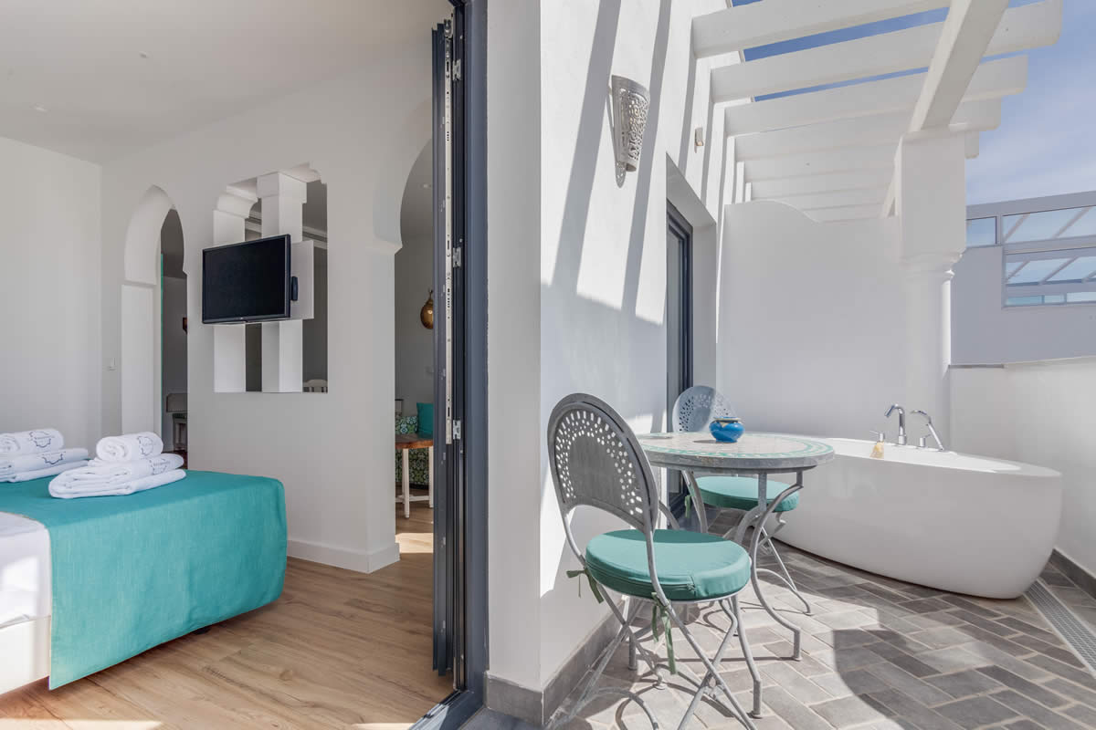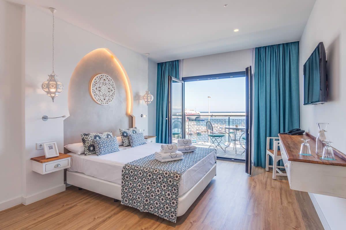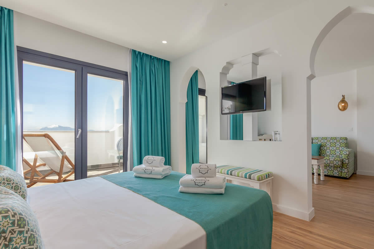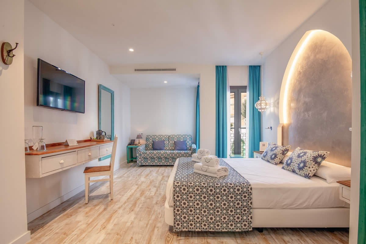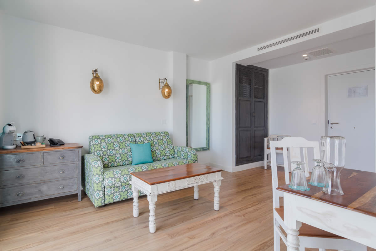 Es ist die größte und die einzige Junior Suite mit Meerblick. Ihre große Terrasse, die mit Tisch, Stühlen und Sonnenliegen sowie einer Außenbadewanne ausgestattet ist, ist das perfekte Zimmer, um die Lage des Hotels vom dritten Stock aus zu genießen.