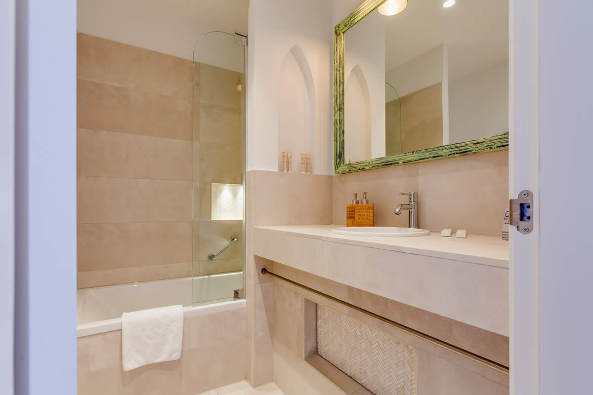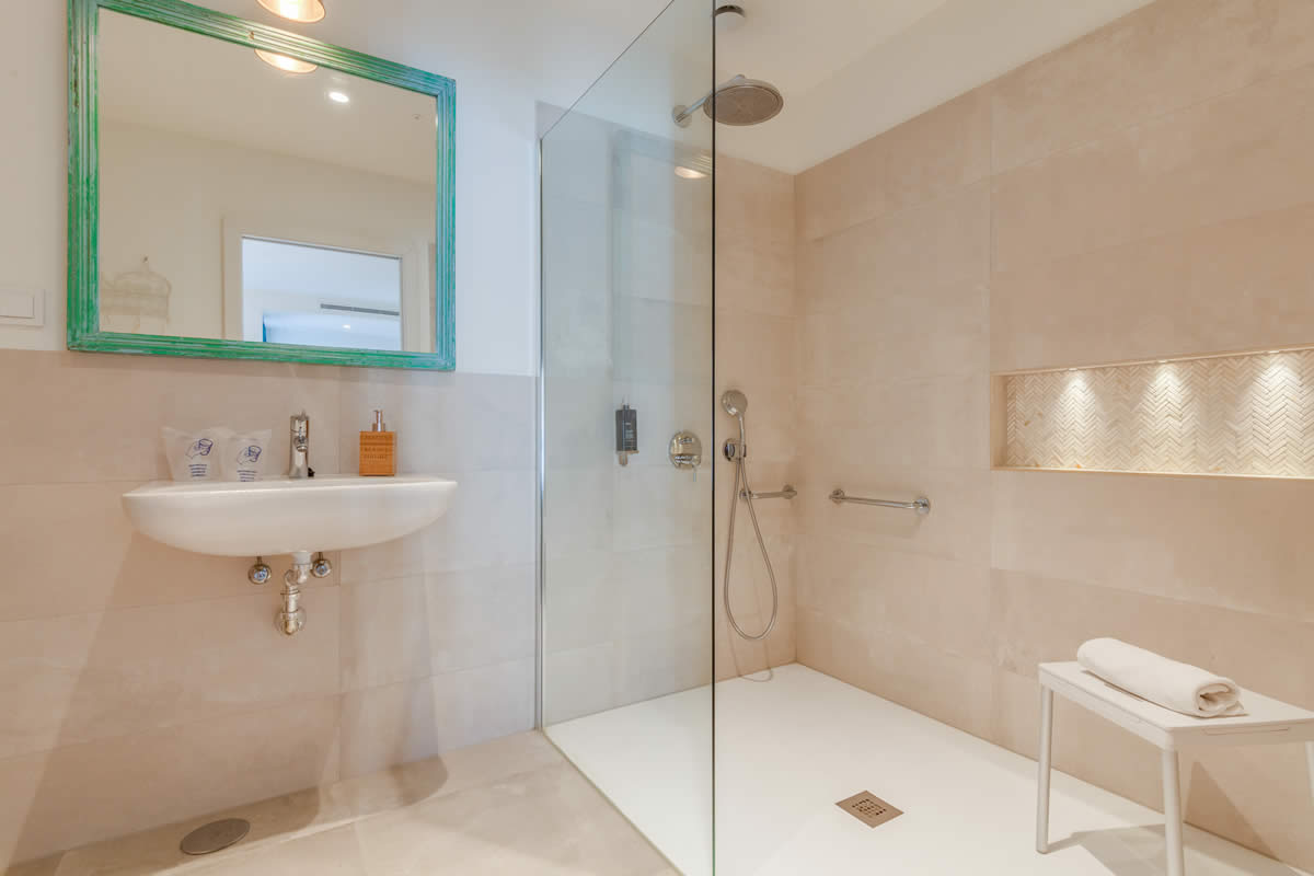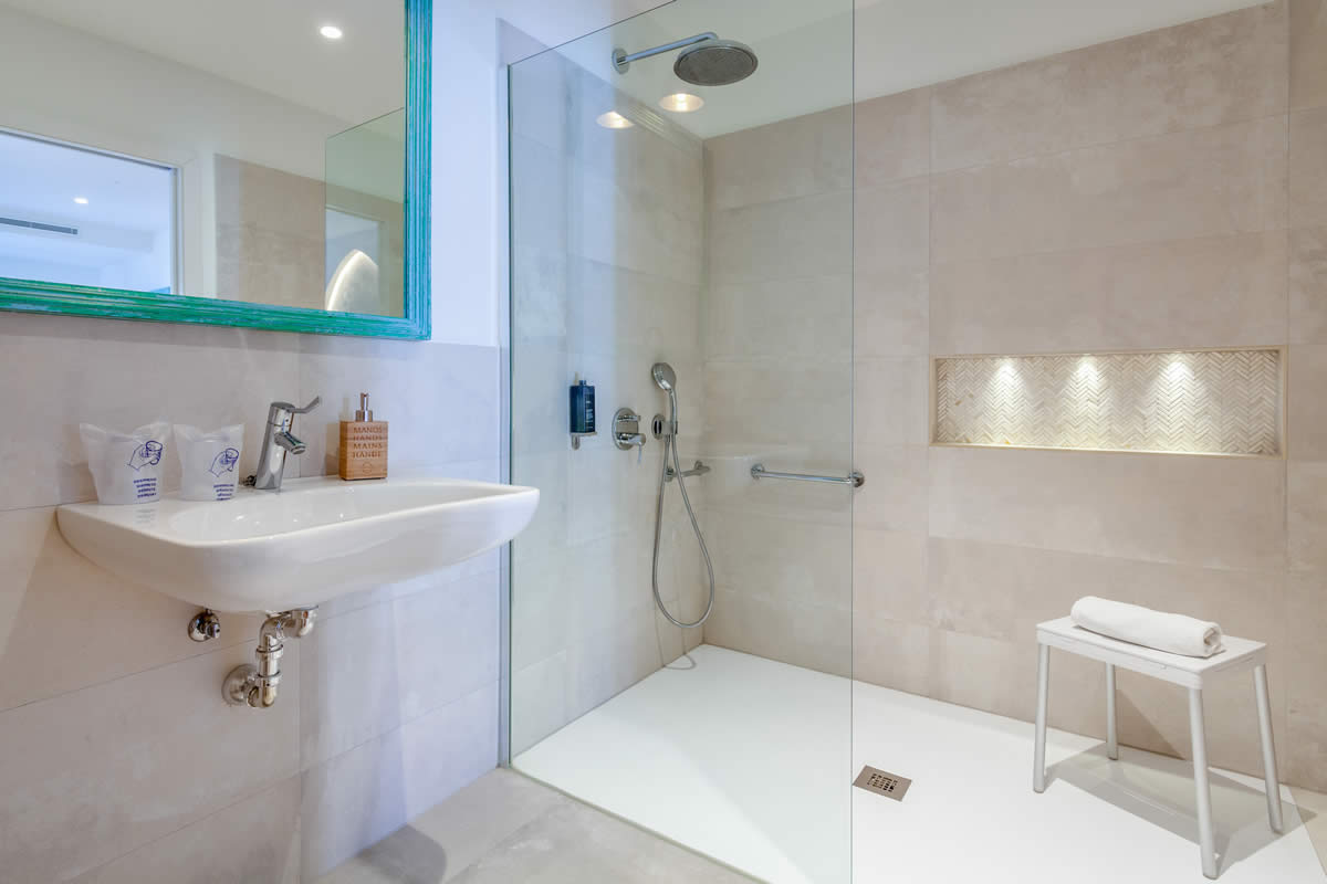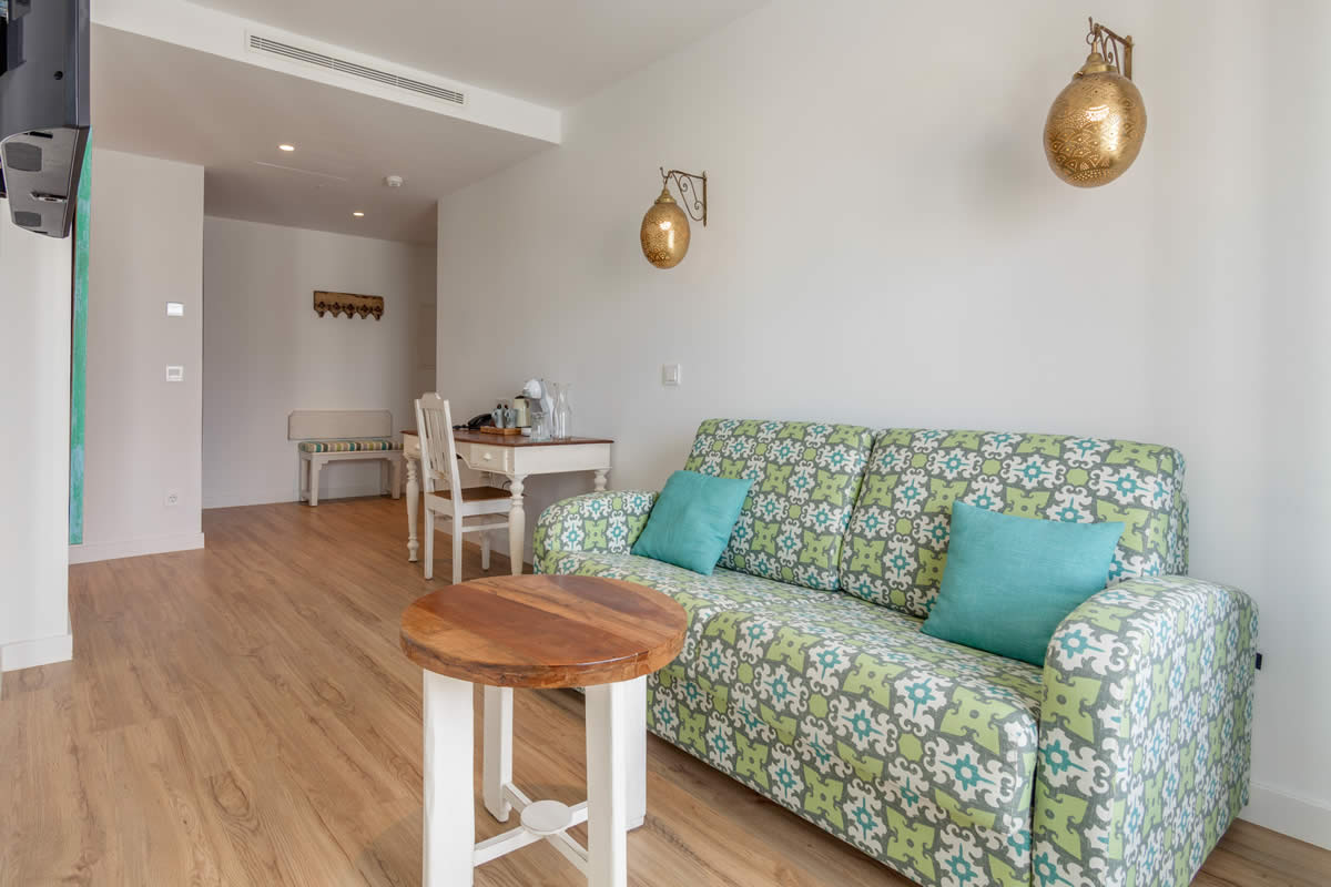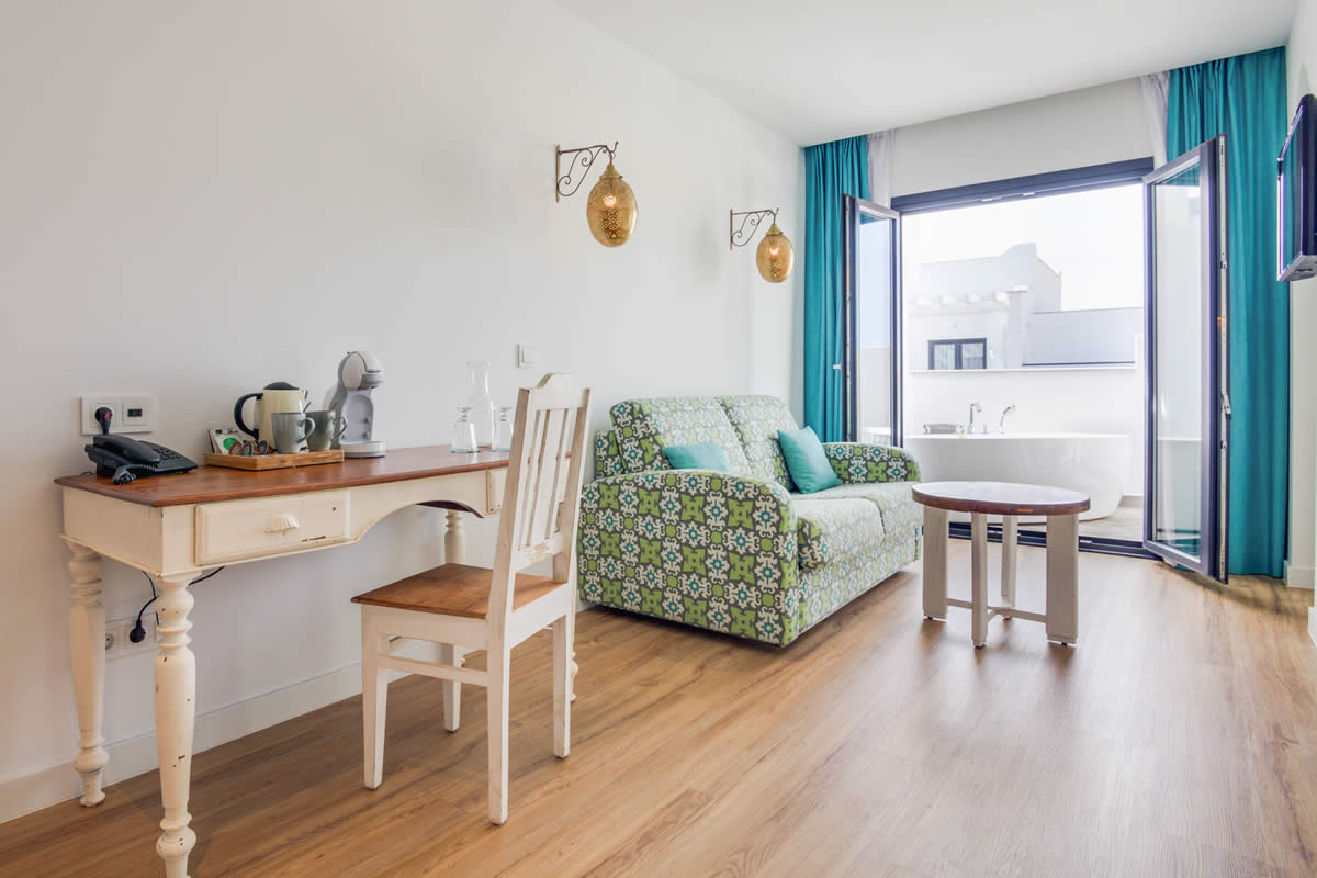 Es ist die größte und die einzige Junior Suite mit Meerblick. Ihre große Terrasse, die mit Tisch, Stühlen und Sonnenliegen sowie einer Außenbadewanne ausgestattet ist, ist das perfekte Zimmer, um die Lage des Hotels vom dritten Stock aus zu genießen.