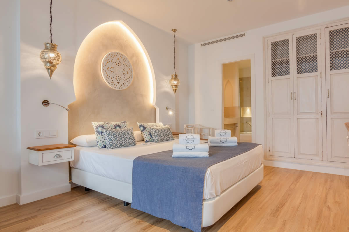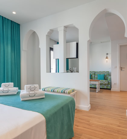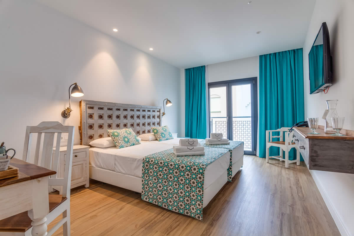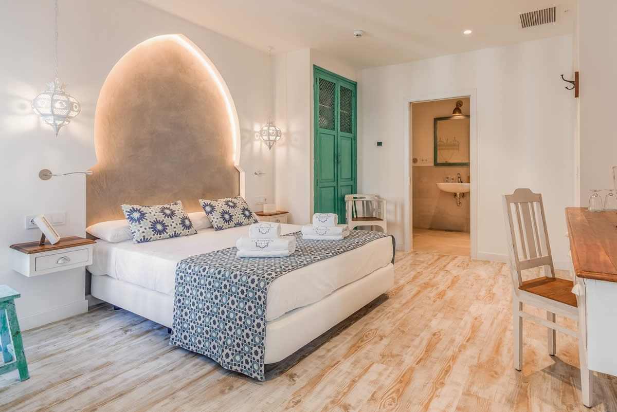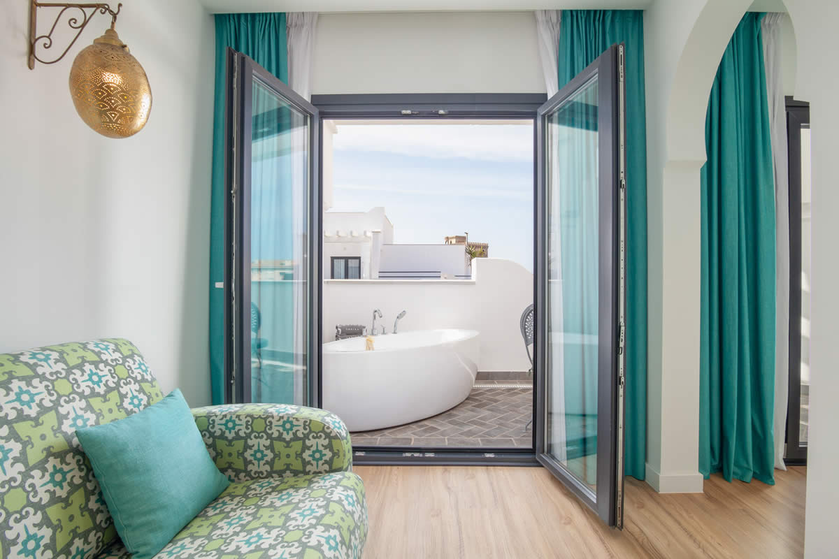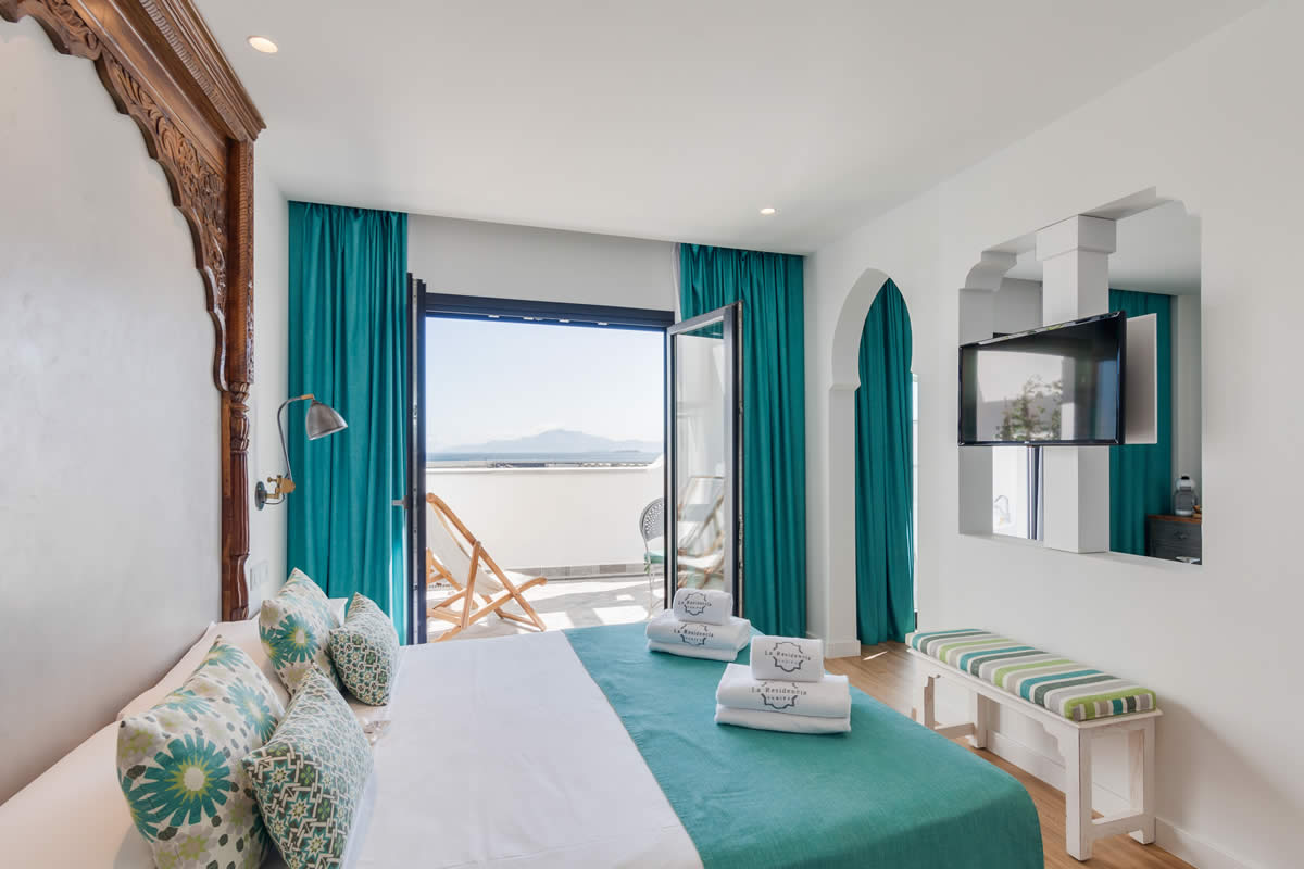 Die Hotelzimmer sind in Pastelltönen gehalten, in den Farben des Meeres und der Landschaft von Tarifa. Die Atmosphäre wurde so gestaltet, dass sie zu Ruhe und Entspannung einlädt.