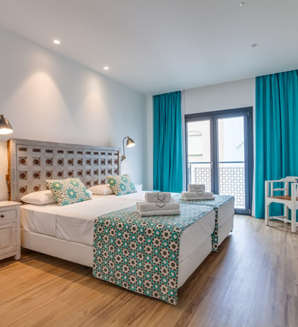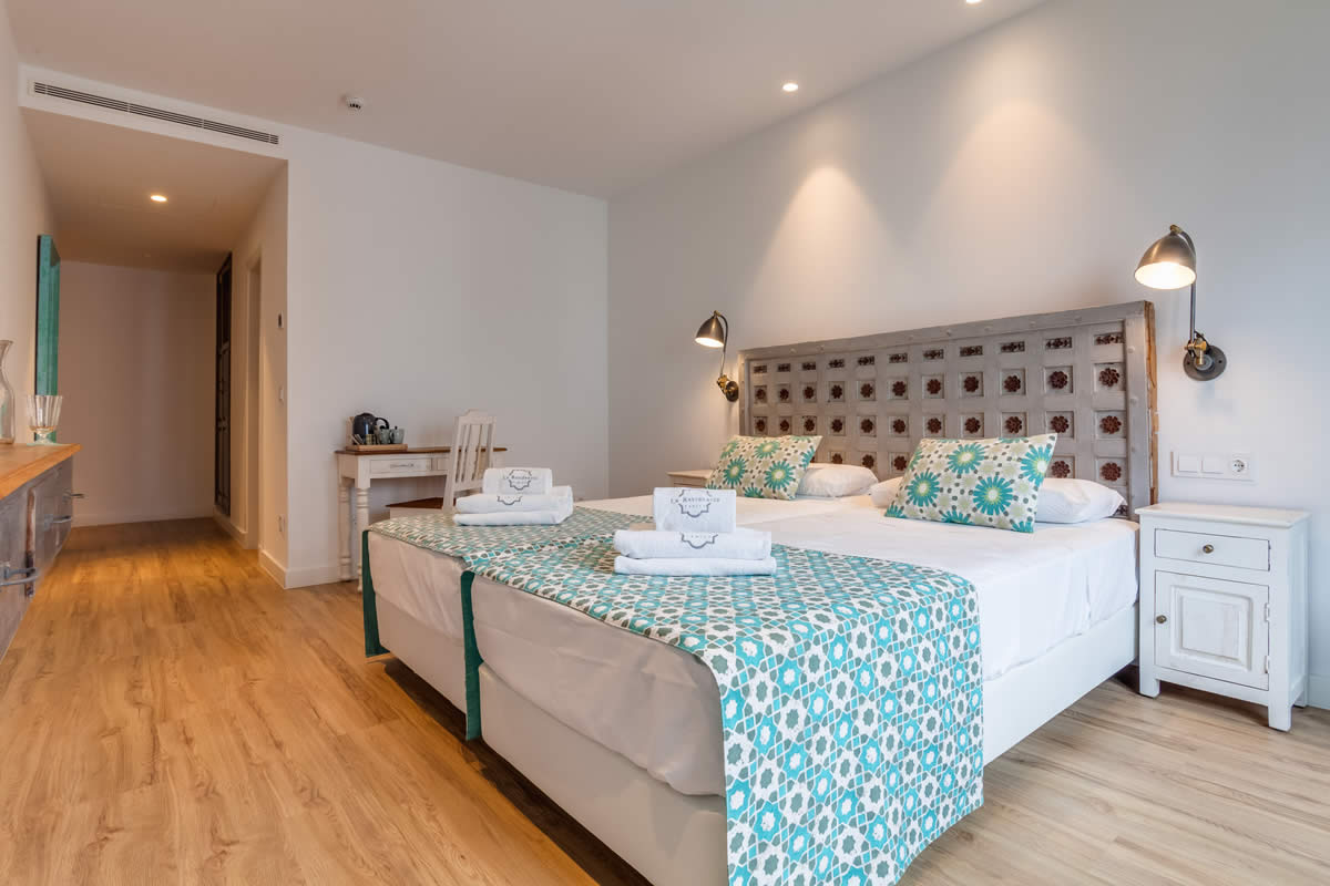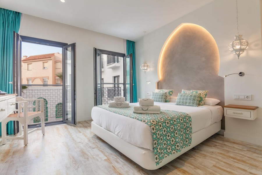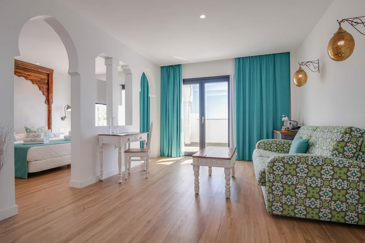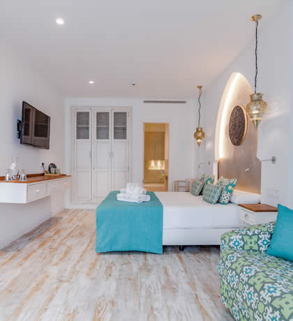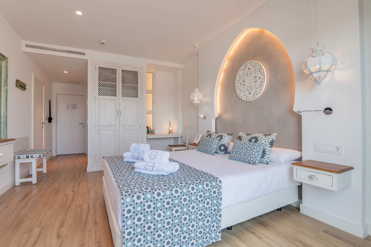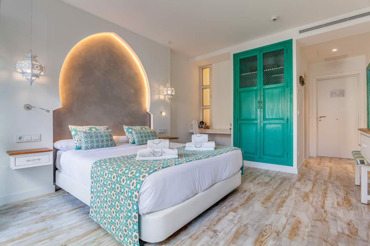 Die Hotelzimmer sind in Pastelltönen gehalten, in den Farben des Meeres und der Landschaft von Tarifa. Die Atmosphäre wurde so gestaltet, dass sie zu Ruhe und Entspannung einlädt.