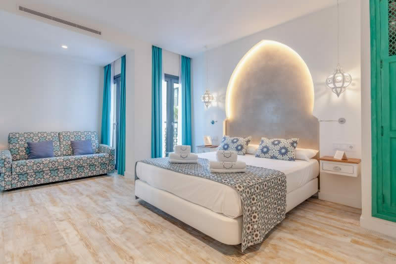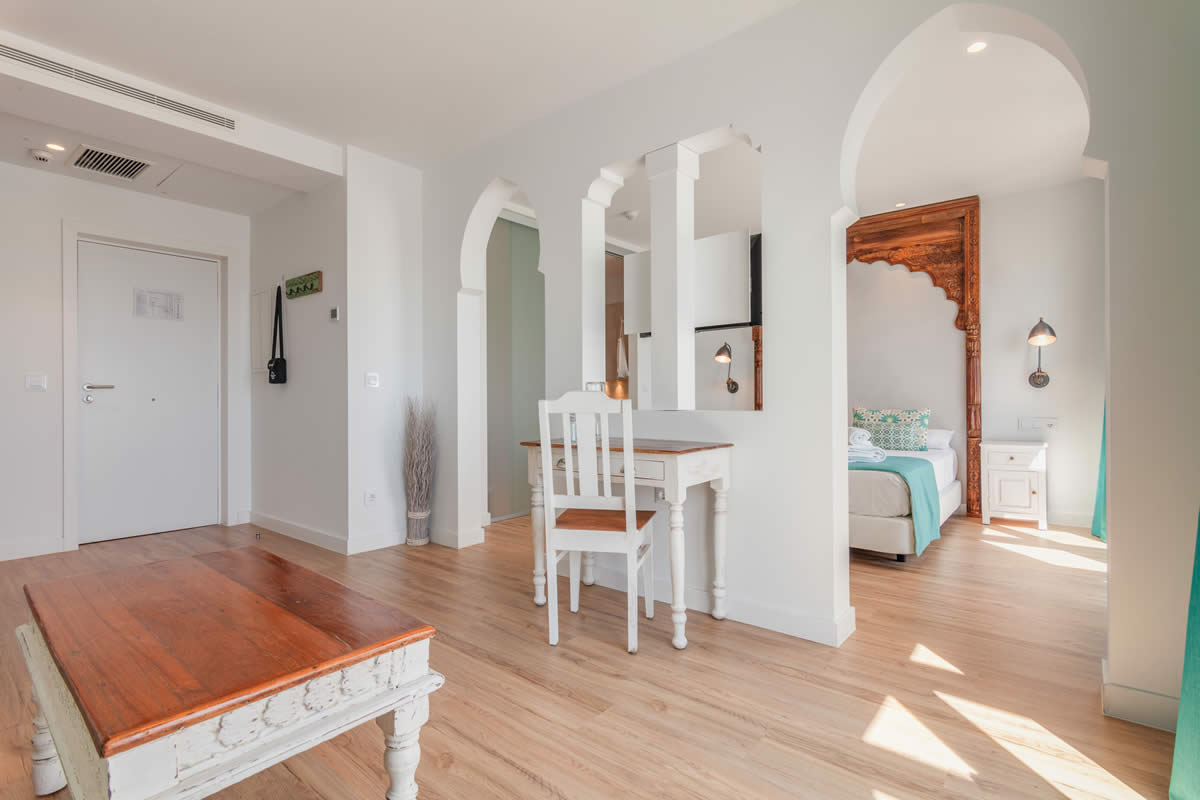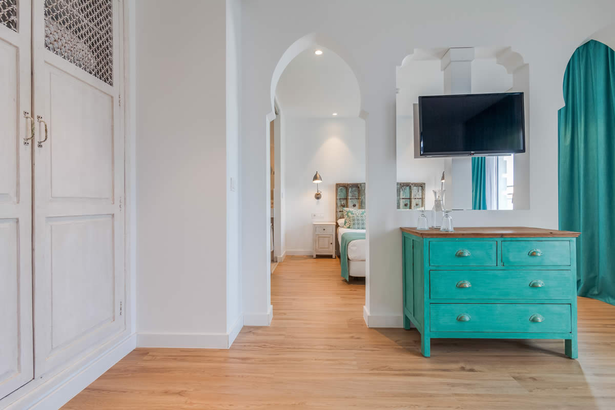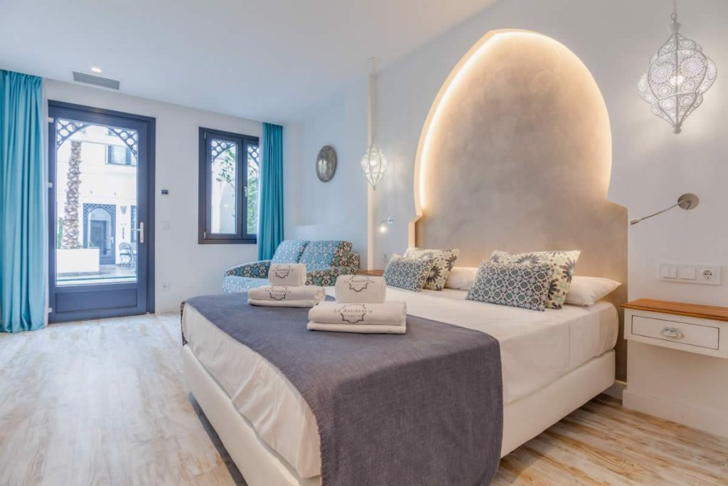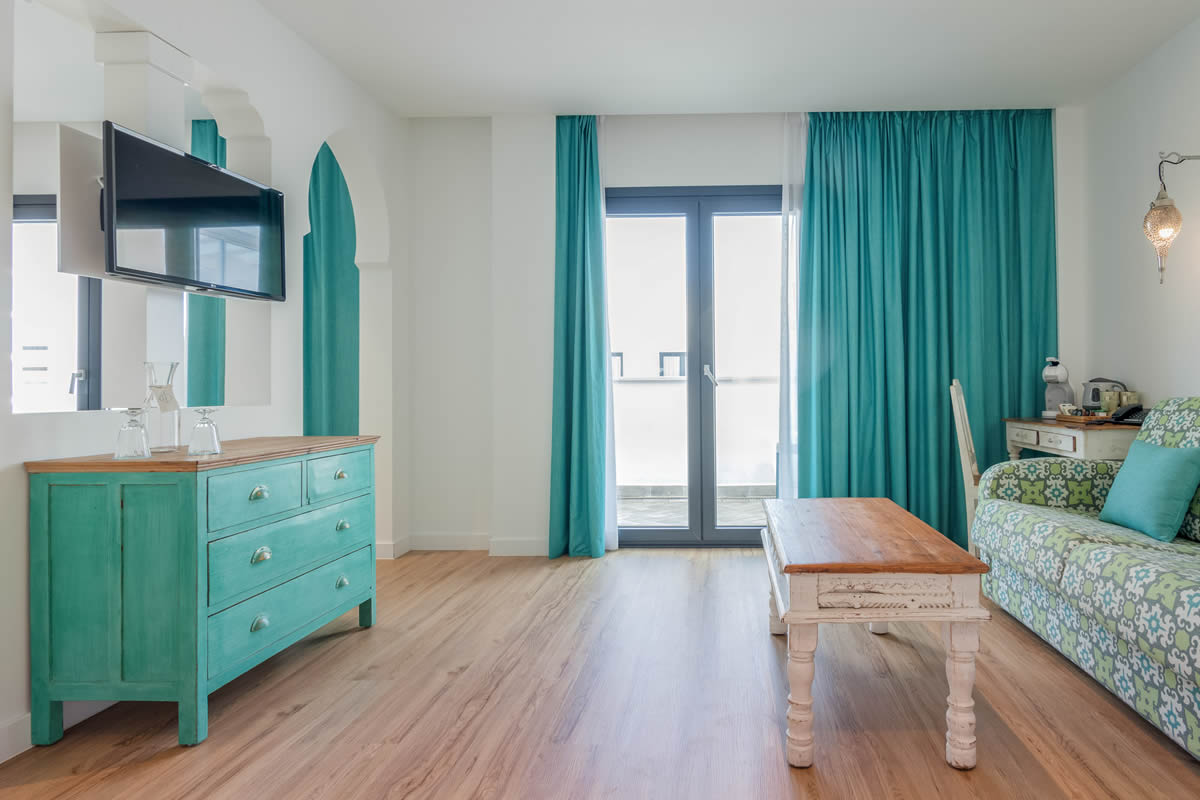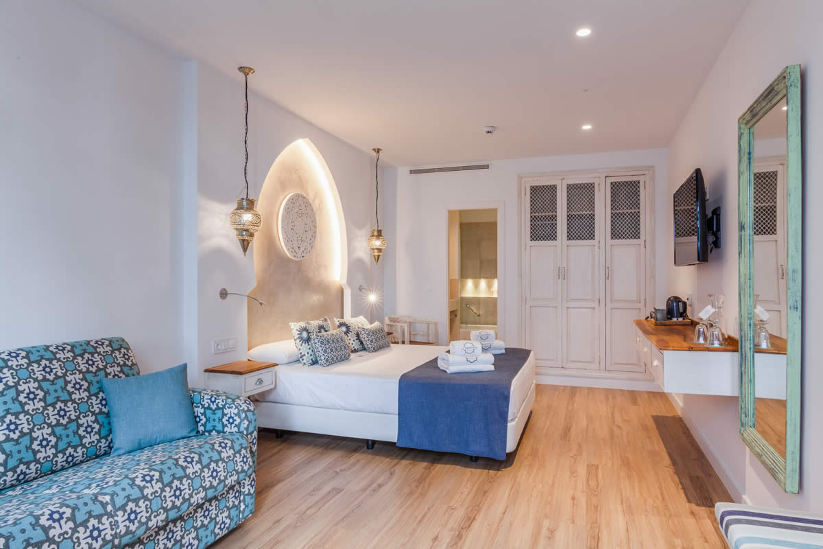 Die Hotelzimmer sind in Pastelltönen gehalten, in den Farben des Meeres und der Landschaft von Tarifa. Die Atmosphäre wurde so gestaltet, dass sie zu Ruhe und Entspannung einlädt.
