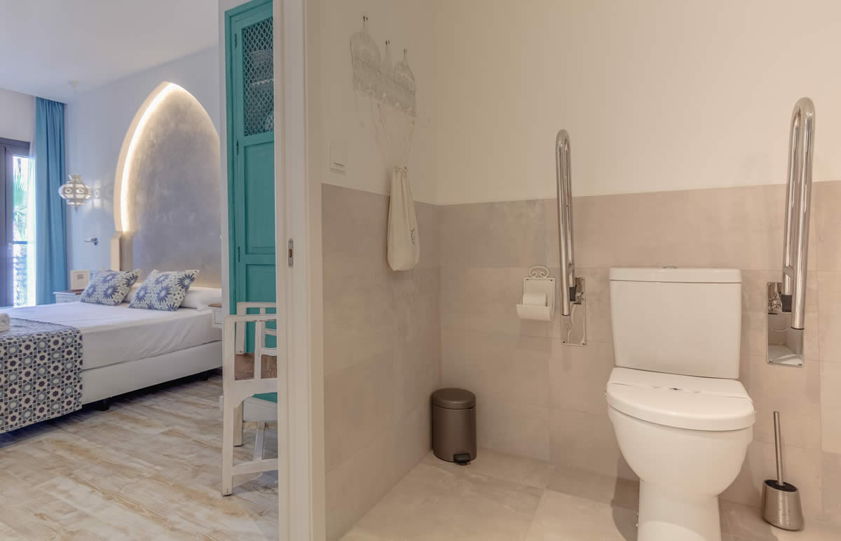 Wenn Sie besondere Bedürfnisse haben, gibt es auf den Etagen 1 und 2 zwei Zimmer die so ausgestattet wurden, um Ihnen den Zugang zu erleichtern. Sie sind geräumiger, haben ein Schlafsofa, ein Badezimmer mit Schiebetür, spezielle Toiletten, eine sehr große Dusche und einen Zugang, der für die Breite eines Rollstuhls geeignet ist. Die Zimmer sind komfortabel und groß und können bis zu 3 Erwachsene beherbergen. Wenn Sie weitere Informationen benötigen, wenden Sie sich bitte an unsere Rezeption.