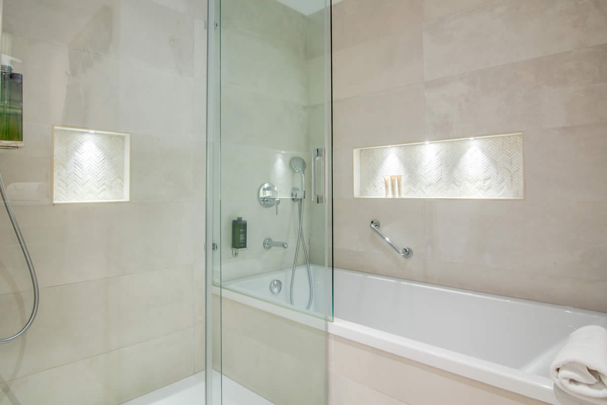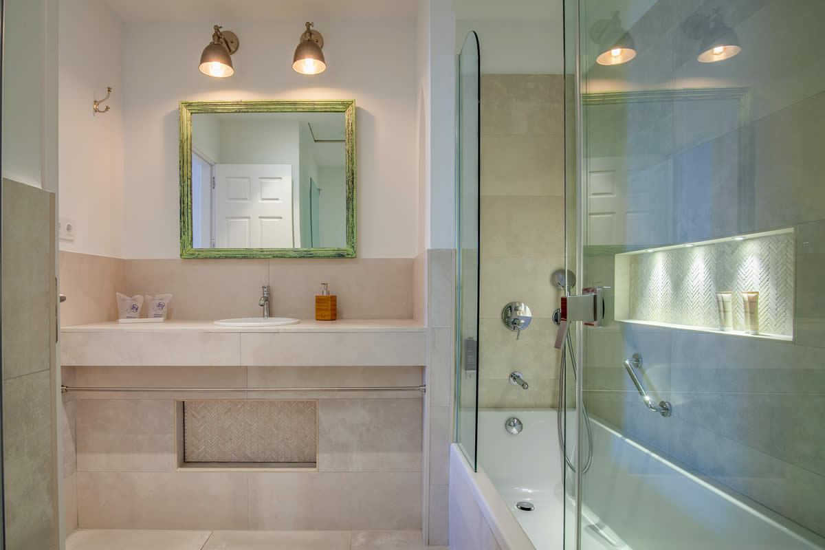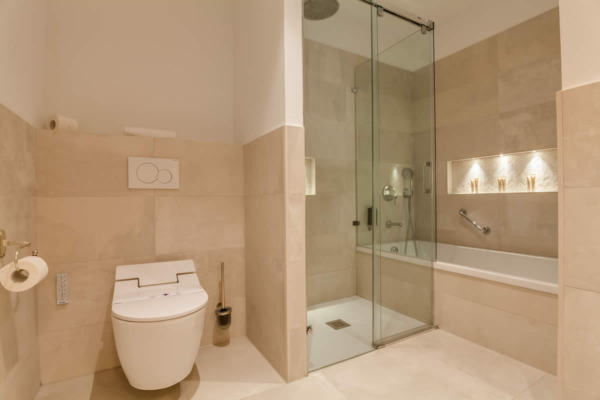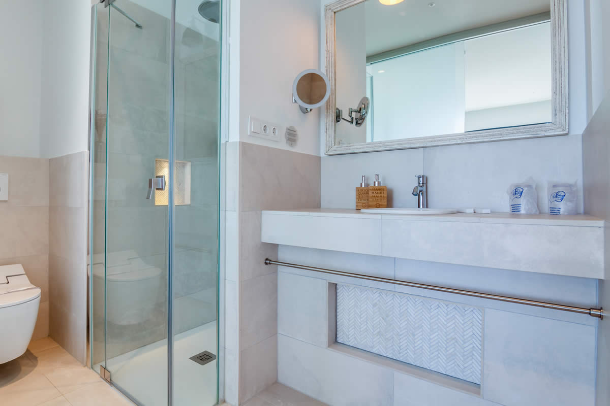 In der oberen Etage bieten wir grosszügig angelegte Zimmer mit maximalen Komfort an. Wunderbar geeignet für alle Gäste die mehr Platz bevorzugen und natürlich für Familien. Eine Trennwand trennt das Schlafzimmer vom Wohnzimmer und Sie verfügen über ein großes Badezimmer mit Badewanne, Dusche und separatem WC. Bis zu 3 Erwachsene können in der Junior Suite übernachten, die mit einem Queen-Size-Bett und einem Schlafsofa ausgestattet ist. Die ca. 12 m2 große Terrasse ist für maximalen Kompfort ausgelegt: die Außenbadewanne wird Ihnen Momente der puren Entspannung bescheren und Sie können so die Westausrichtung in den besten Stunden der Nachmittagssonne genießen.